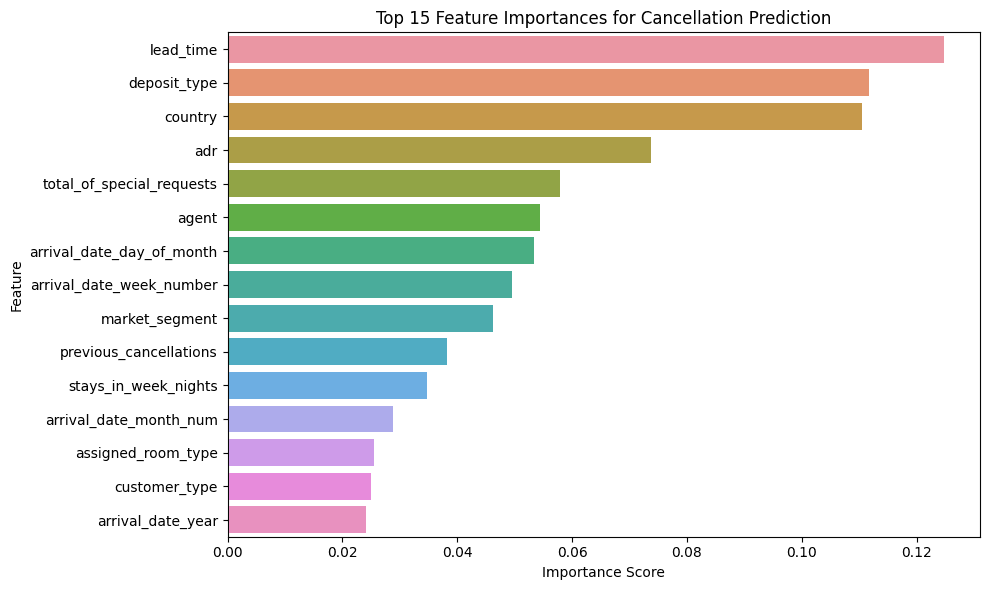 ROC-AUC Score: 0.96 — indicating strong class separation between cancellations and non-cancellations.